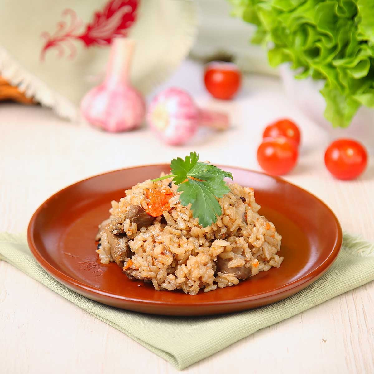 Мякоть свинины, рис, морковь, лук репчатый, чеснок, масло подсолнечное, соль, приправа Зира, барбарис.