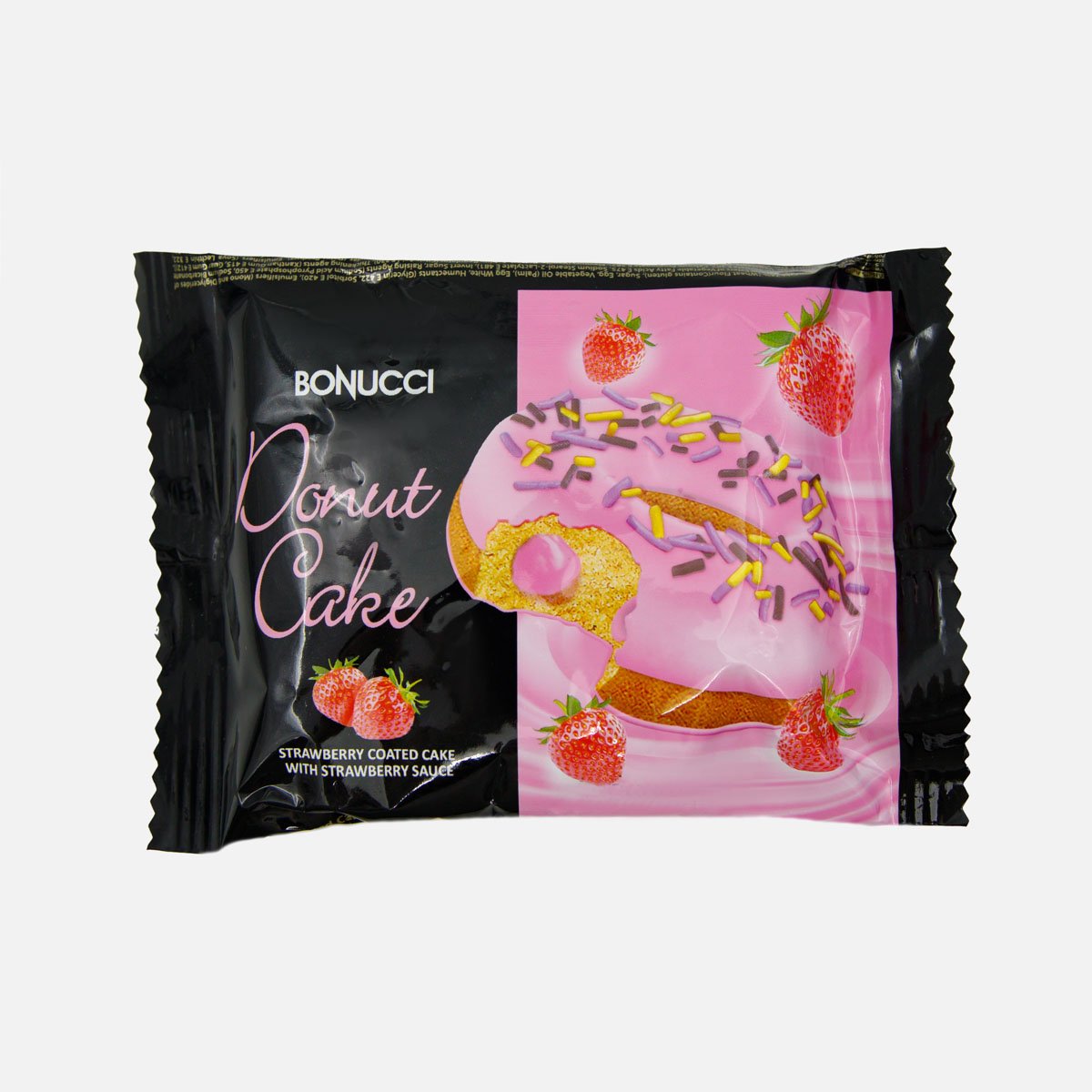 Пончик Бонуччи с клубничным наполнителем и клубнич соусом 40г