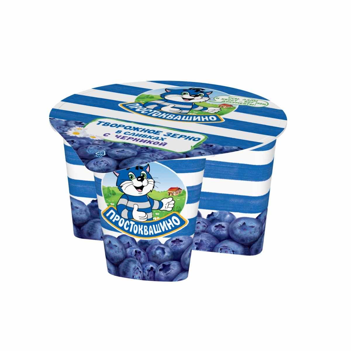 Творожное зерно "Простоквашино" 7% жирности в сливках с черничным вареньем.