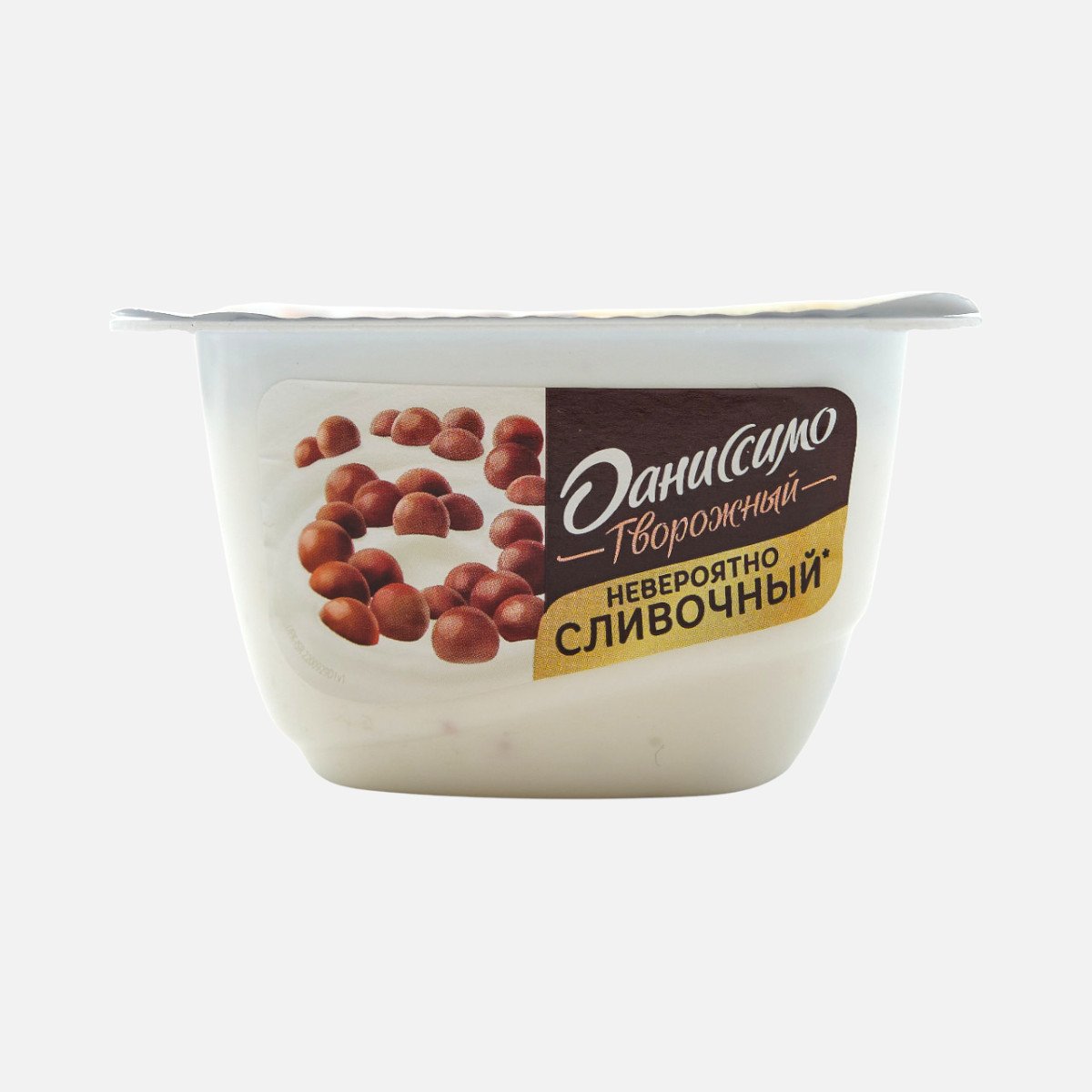 Мягкий творожный десерт "Даниссимо" 7,3% с хрустящими шоколадно-злаковыми шариками.
