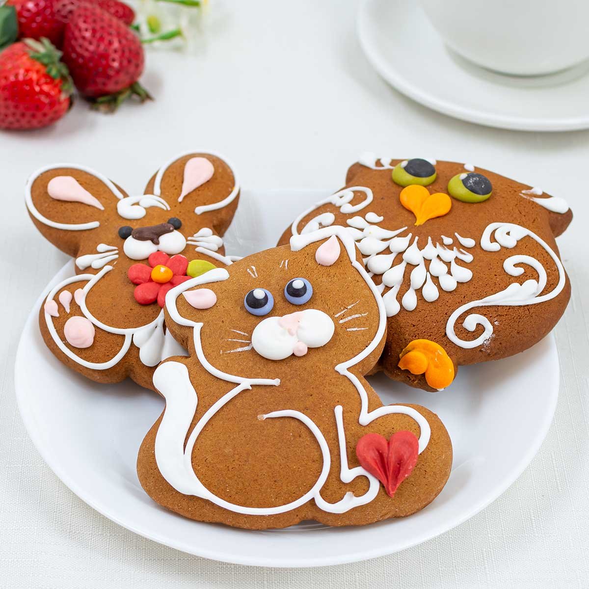 Мука пшеничная в/с, сахар, сахарная пудра, яйцо куриное, масло сливочное, глюкозный сироп, сода, лимон, корица, имбирь, кардамон, мускатный орех, гвоздика, краситель пищевой.