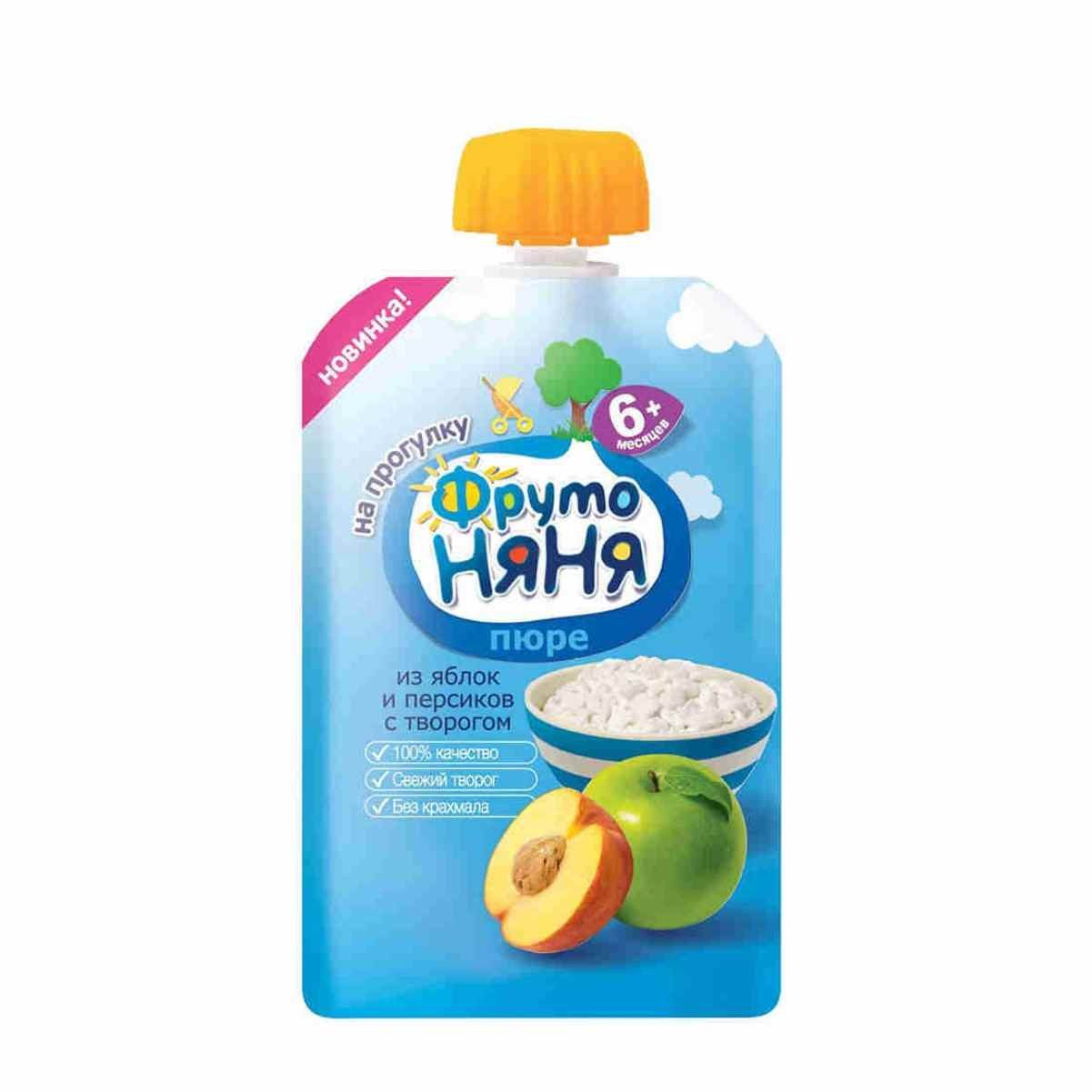 Фруктово-творожное пюре "Фрутоняня" с яблоками и персиками. Удобная упаковка позволит накормить ребенка в любой момент.
