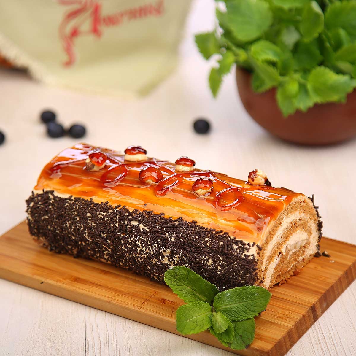 Мягкий рулет с нежным кремом из растительных сливок и вареного сгущенного молока подкупает своим гармоничным вкусом. Спелые бананы добавляют тропическую сладость, а легкий акцент фундука делает десерт неповторимо изысканным. Гладкая текстура теста, приготовленного из муки, яиц и соды с щепоткой лимонной кислоты, идеально сочетается с кондитерским гелем и изысканной посыпкой. Этот рулет – праздник вкуса, который можно заказать с доставкой прямо к вашему столу. Наслаждение гарантировано!