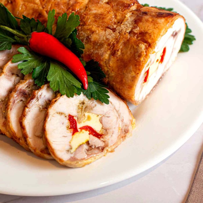 Необычный рулет из филе цыпленка, начиненный сыром моцарелла и пикантным болгарским перцем