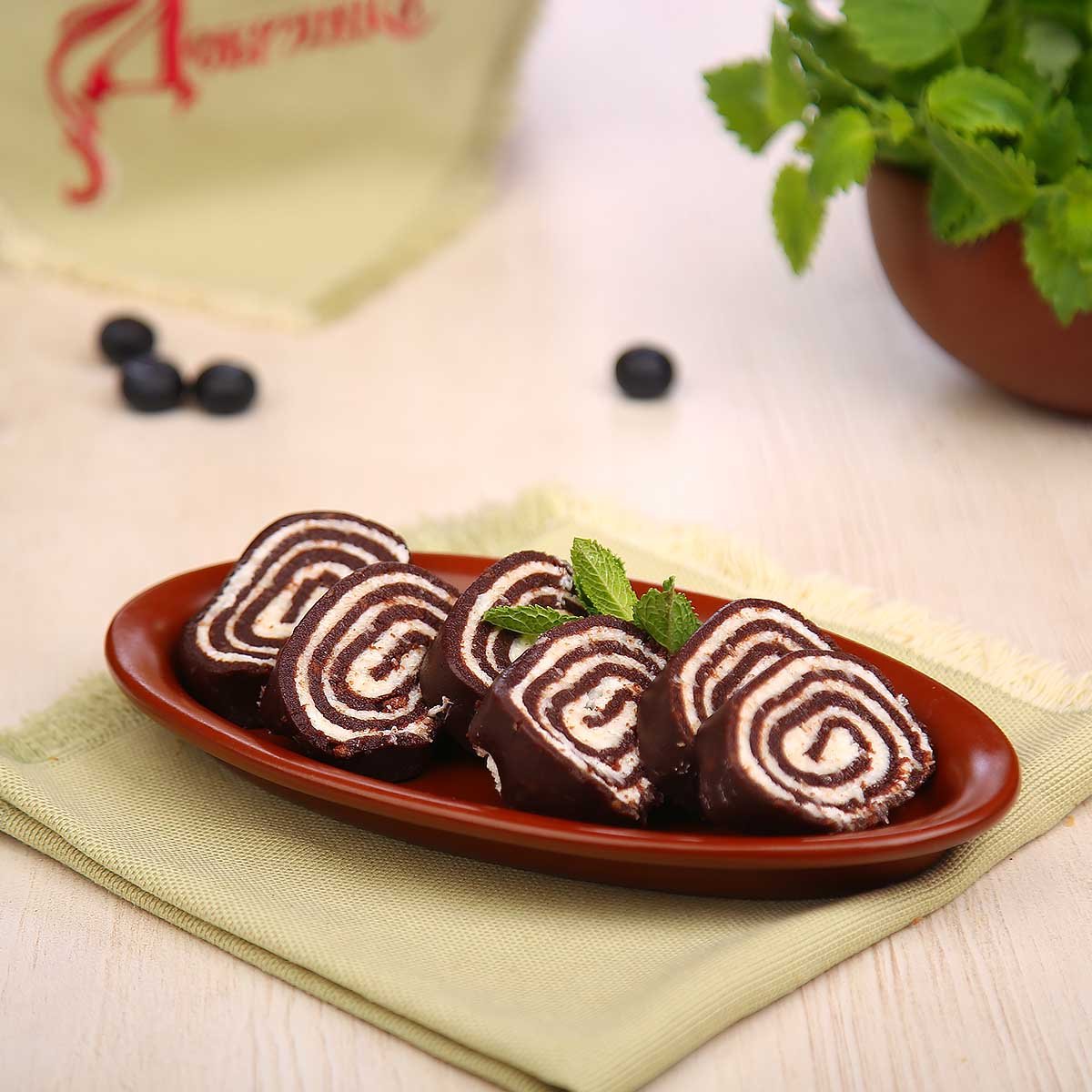 Масло сливочное, сахар, яйцо куриное, сахарная пудра, мука пшеничная в/с, молоко сгущенное, кокосовая стружка, коньяк, какао-порошок, ароматизатор Ром, ванилин.