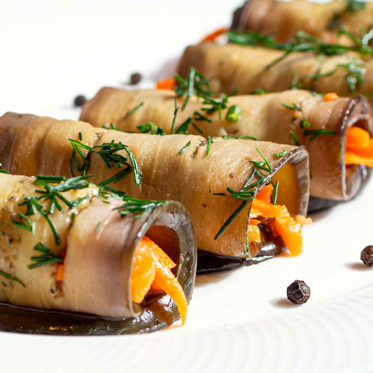 Баклажаны, морковь, масло подсолнечное, лук репчатый, чеснок, уксус, зелень, сахар-песок, соль, кориандр, специи паприка, перец красный молотый острый