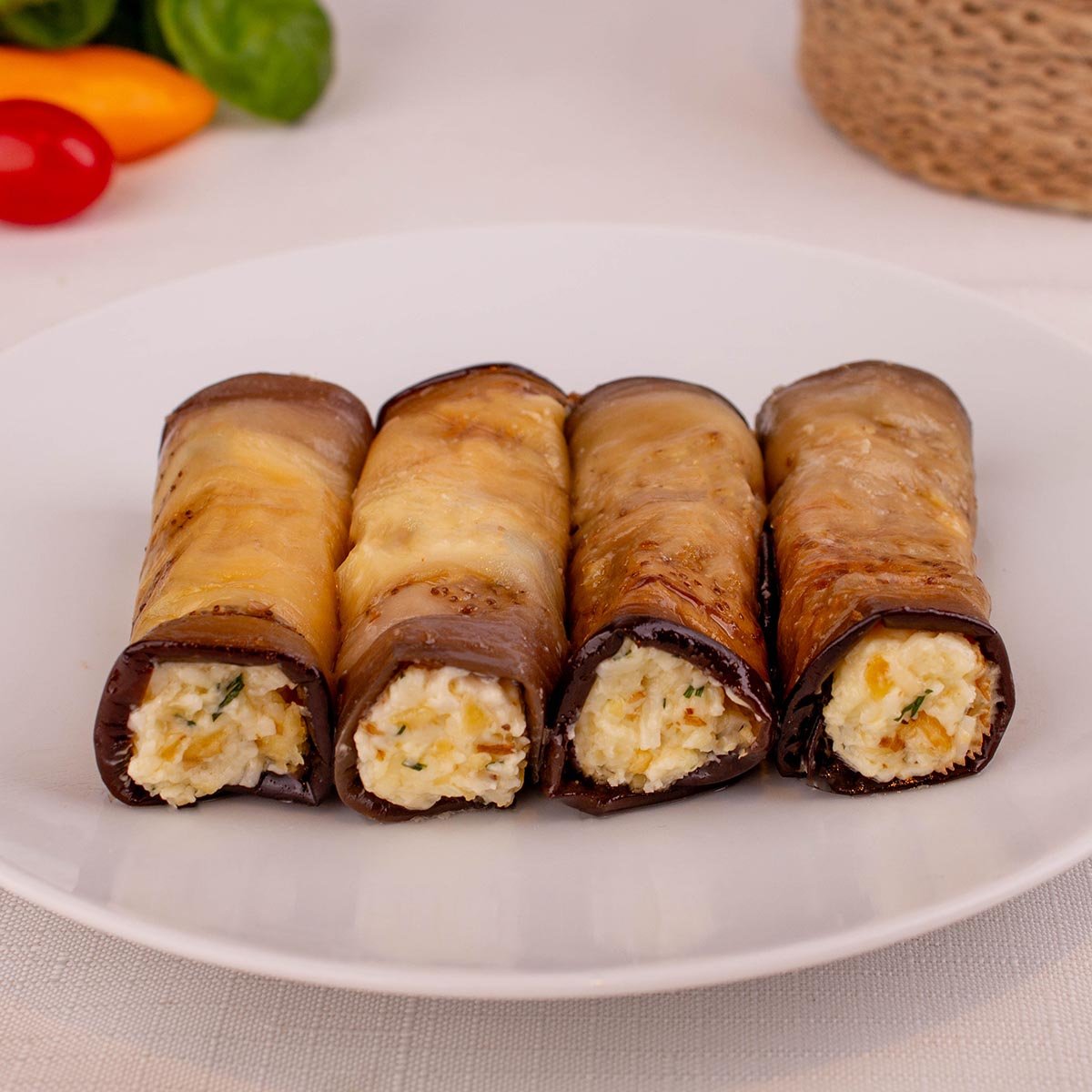 Яркая и аппетитная закуска. Ломтики баклажанов, обжаренные до золотистой корочки, скручены в рулет с пикантной начинкой из сыра, чеснока и грецкого ореха.