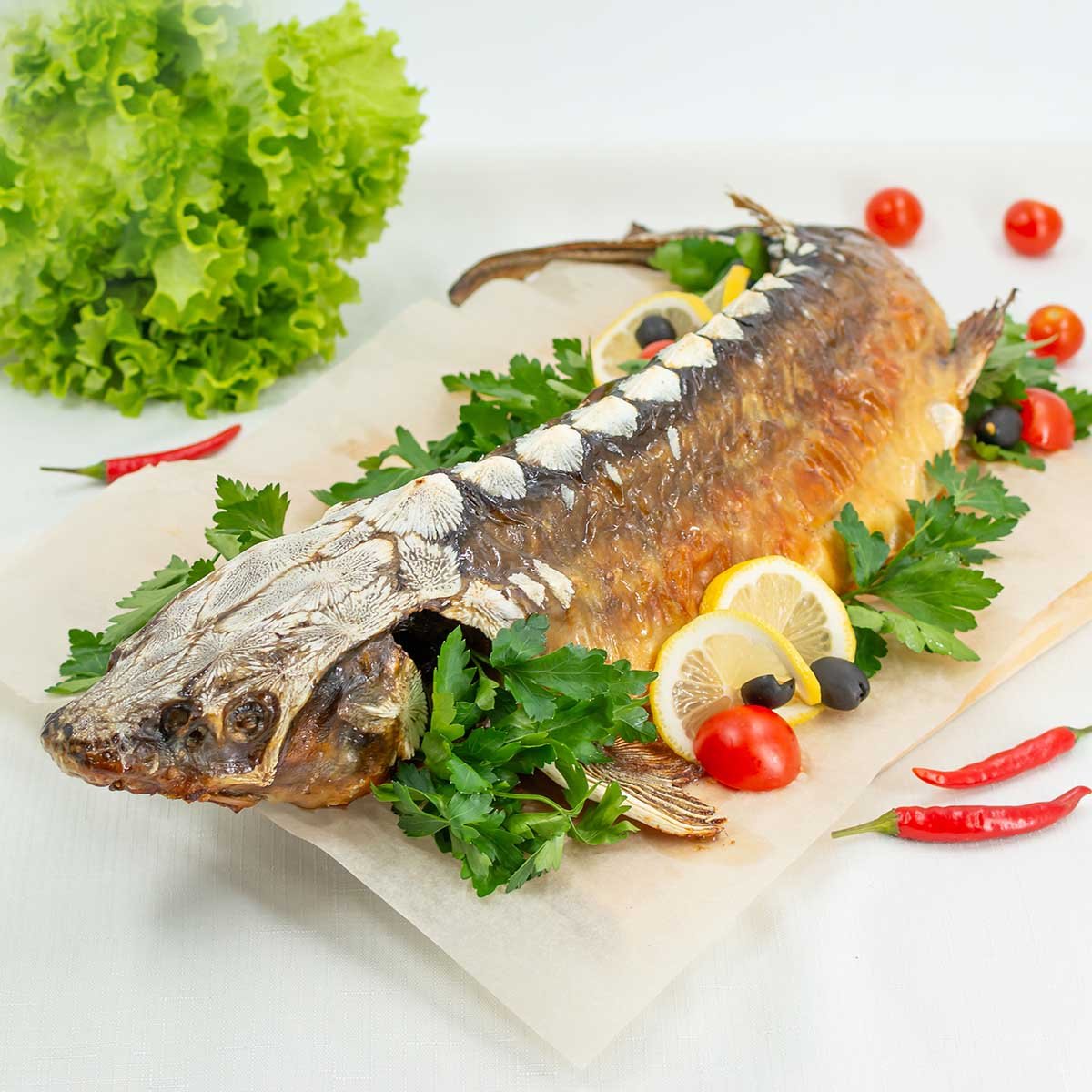 Исторически «красной рыбой» в России называли не лососевых, а осетровых. «Красная» в данном случае значит «самая лучшая, наиболее ценная». Для приготовления этого парадного блюда мы используем минимум приправ, чтобы не заслонить деликатесный вкус самой рыбы. Подготовленного осетра натирают солью, перцем, соком лимона и смазывают рафинированным маслом; оставляют так на 12 часов. Затем его выкладывают на противень и готовят в русской печи в течение 20—25 минут. Жар в печи равномерный, устойчивый и идет со всех сторон. За это время рыба отлично пропекается, оставаясь при этом сочной. Готовую царь-рыбу украшают зеленью, помидорами, маслинами и ломтиками лимона.