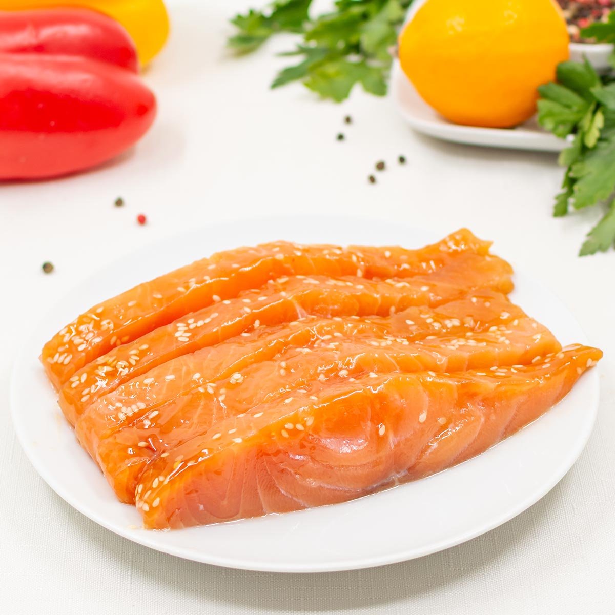 Мы выдержали семгу в аппетитном маринаде из соуса “Терияки” и острого соуса “Чили”, нарезали на ломтики и посыпали семенами кунжута. Угощайтесь!