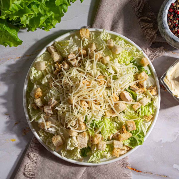 Знаменитый салат в классическом исполнении. Здесь только мясо цыпленка, пекинская капуста, пармезан и одноименный соус. Сверху салат украшают хрустящие сухарики.
