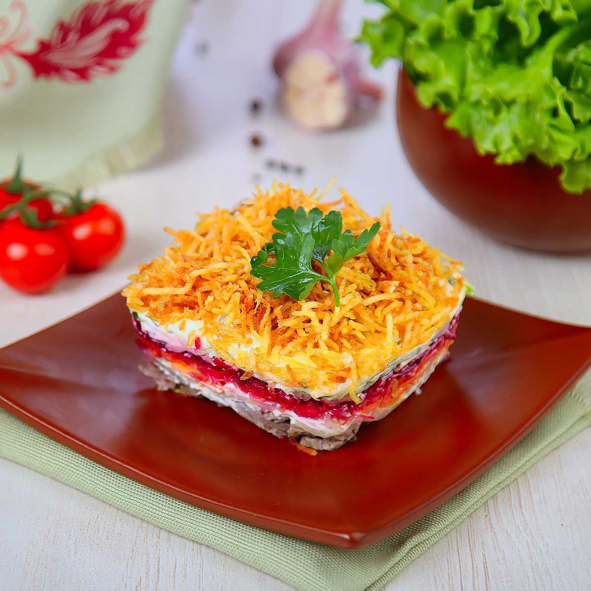 Удивительный слоеный салат из говядины, двух видов капусты, свеклы, моркови и огурчиков. Сверху покрыт шапкой хрустящего картофеля-пай.