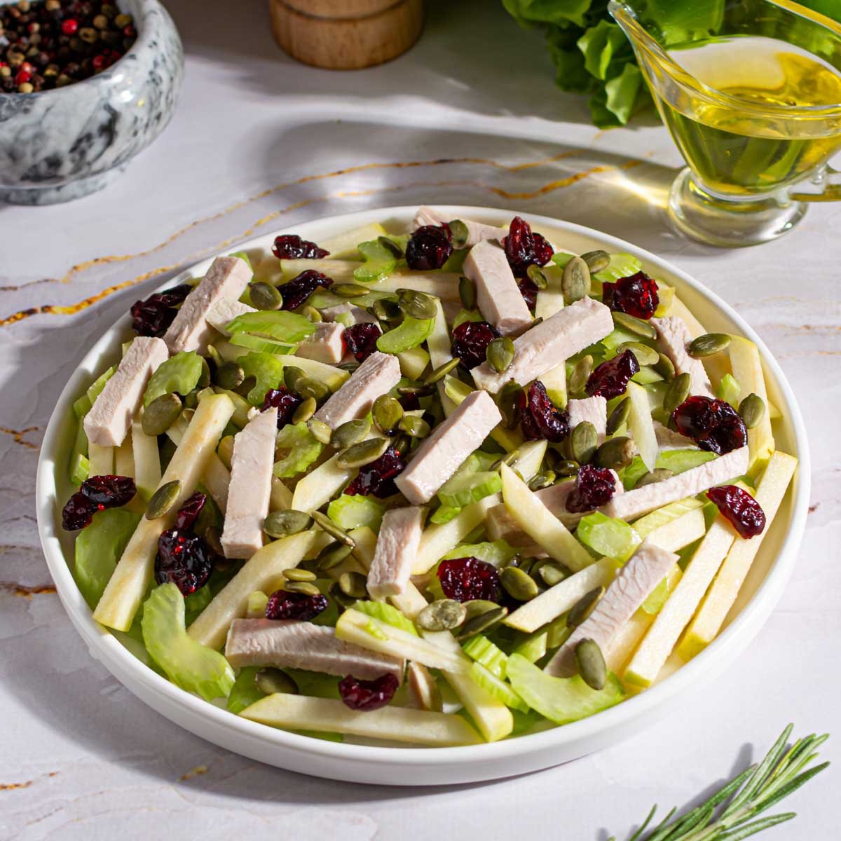 Грудка индейки, яблоки свежие, стебель сельдерея, семя тыквенное, клюква сушеная, масло подсолнечное, мед, сок лимона, апельсин (сок), мята свежая