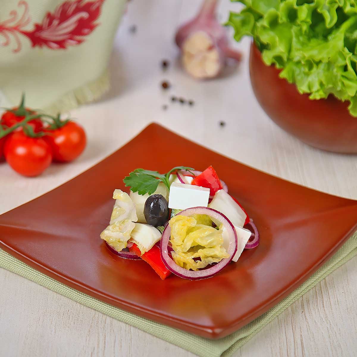 Сытный вегетарианский салат из спелых овощей, брынзы, маслин и оливковой заправки. Идеально сочетается с зерновыми хлебами от нашей пекарни.