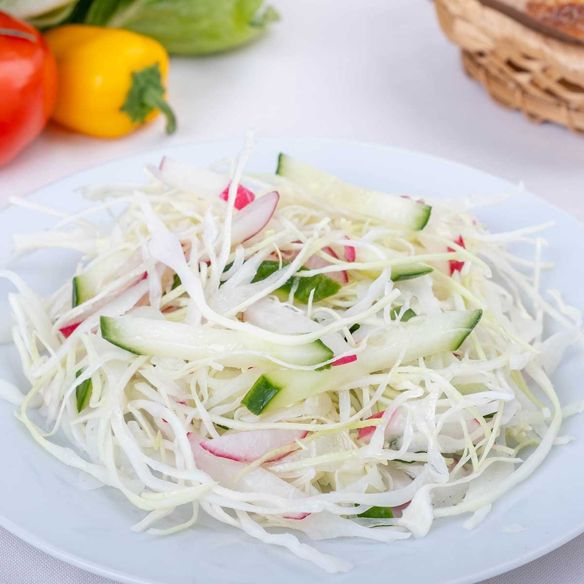 Капуста свежая, огурцы свежие, редис, масло подсолнечное, сахар-песок, уксус, соль, зелень.