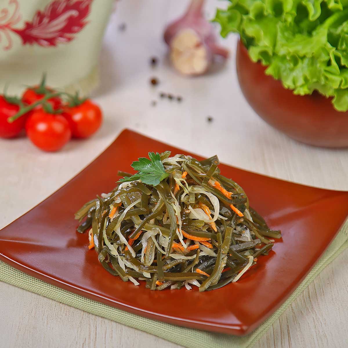 Морская капуста, капуста свежая, масло подсолнечное, морковь, уксус, сахар-песок, соль, лук репчатый, чеснок, кориандр, перец красный молотый острый, специи паприка.