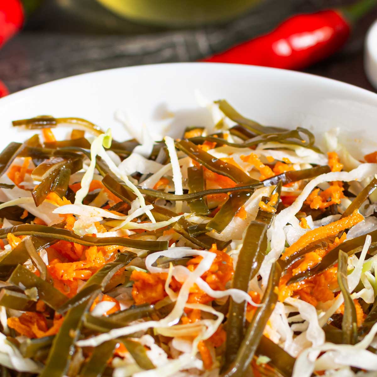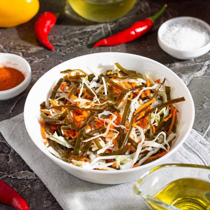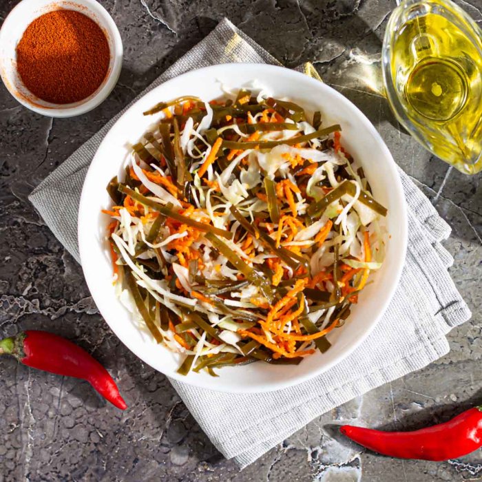 Морская капуста, капуста белокочанная свежая, морковь, масло подсолнечное, сахар, соль, уксус, чеснок, кориандр, перец красный молотый острый, специи паприка.
