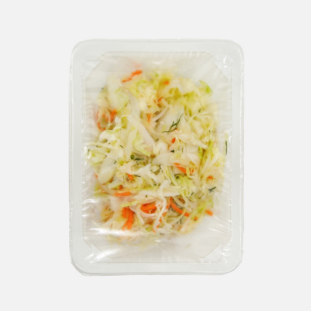 Капуста свежая, морковь, масло подсолнечное, сахар, уксус, соль, зелень. Упаковано с применением условий модифицированной атмосферы.