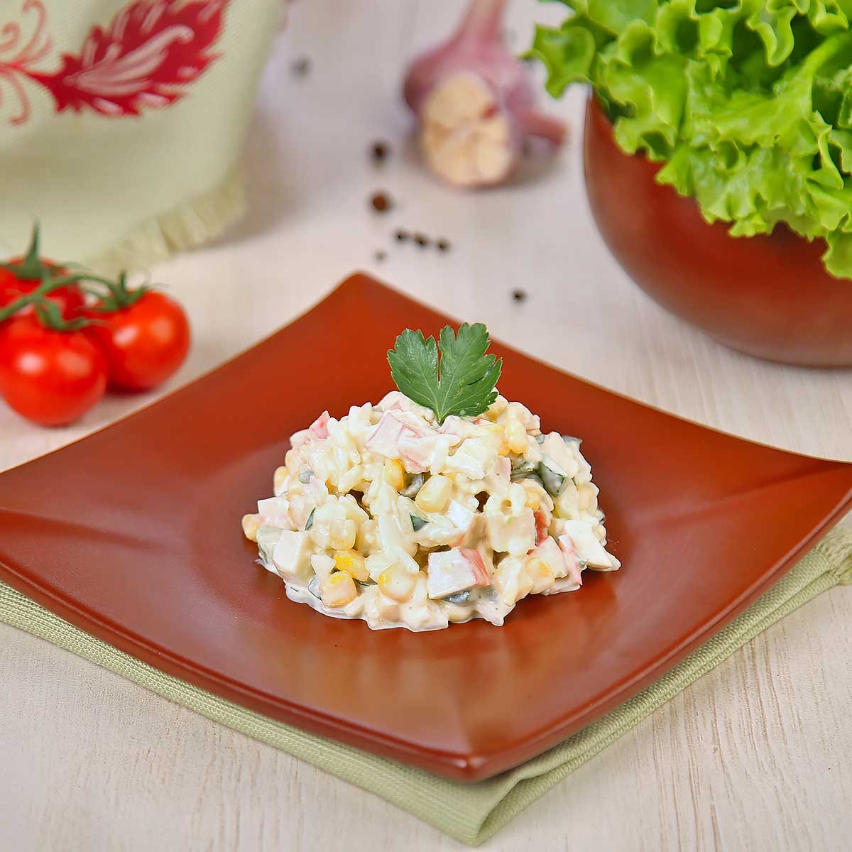 Тот самый "крабовый салат" с мясом краба, кукурузой и свежими огурчиками. Дополните его подачу тарталетками или нашими хрустящими хлебами.