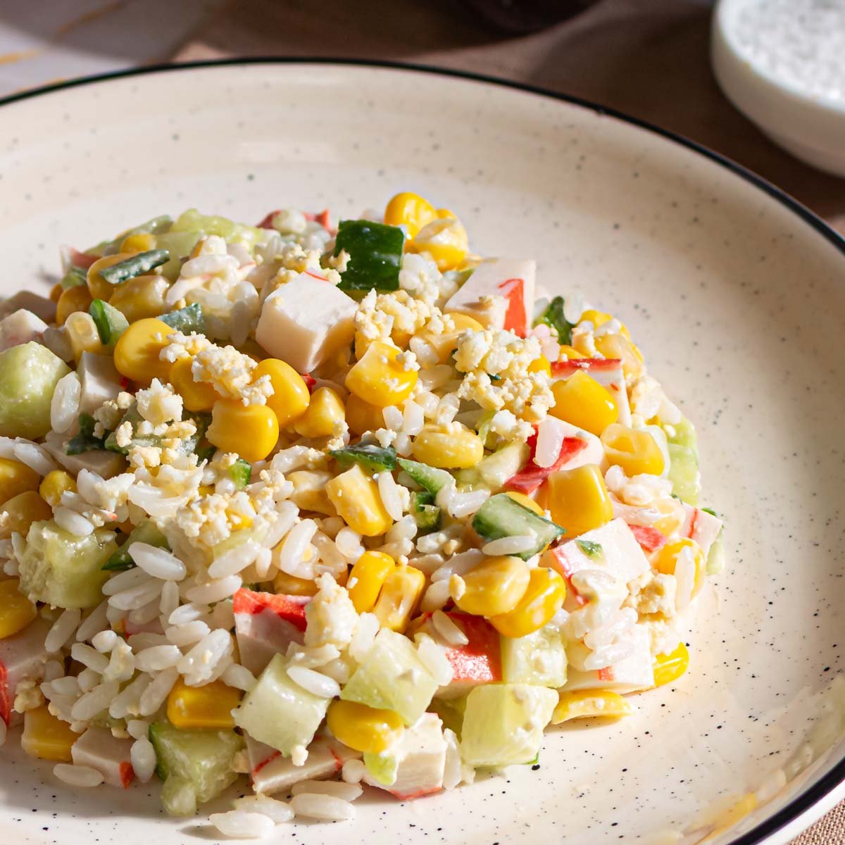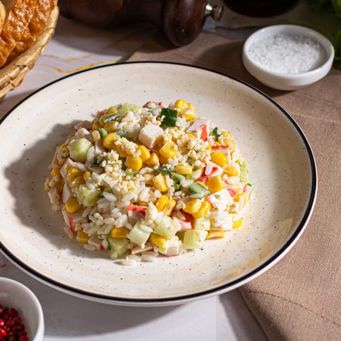 Крабовое мясо (имитация), кукуруза консервированная, огурцы свежие, майонез, яйцо куриное, рис, зелень, соль.
