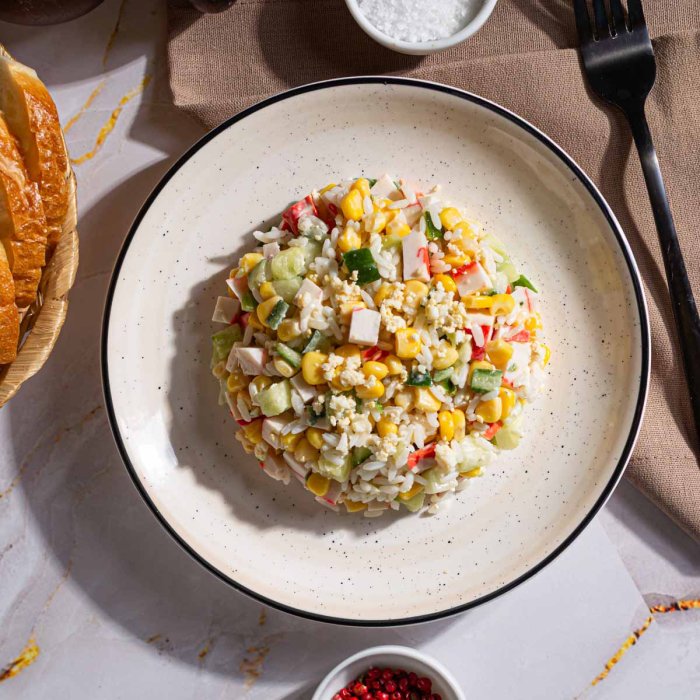 Тот самый "крабовый салат" с мясом краба, кукурузой и свежими огурчиками. Дополните его подачу тарталетками или нашими хрустящими хлебами.