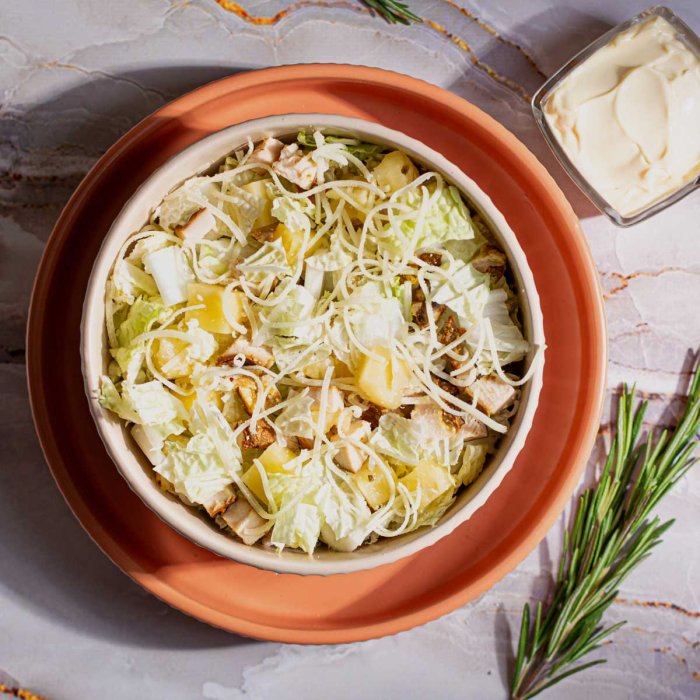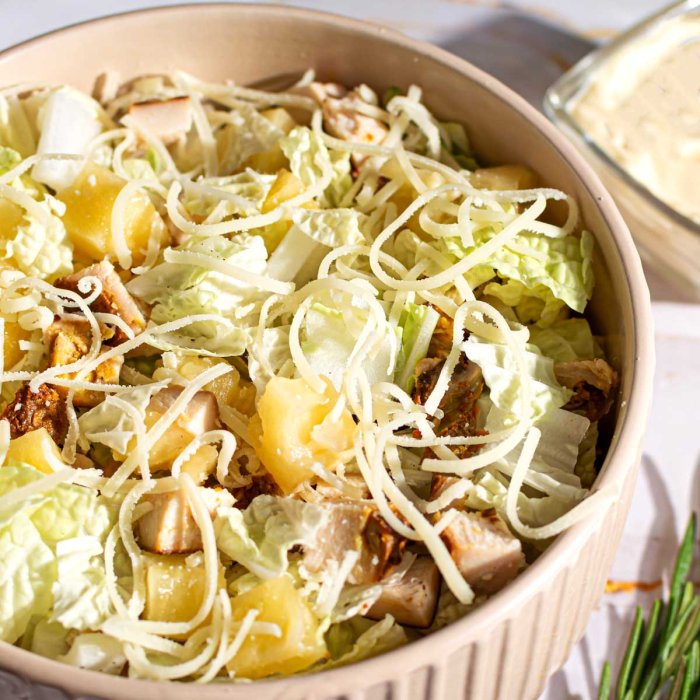 Интересный салат с цыпленком, хрусткой пекинской капустой и ананасами, щедро посыпанный пармезаном. Пикантности добавляют пряные приправы и майонезная заправка на основе майонеза с соевым соусом и лимоном.