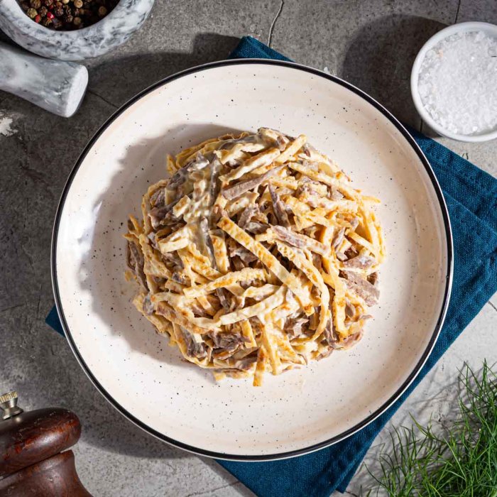 Сытный мясной салат из отборной говядины, лучка и яиц с майонезом и зеленью. Возьмите в дополнение хрустящий хлебушек из нашей пекарни или подавайте в тарталетках.