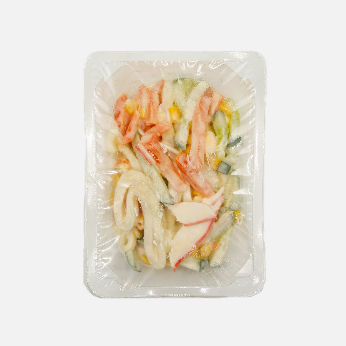 Кальмары, огурцы свежие, морковь, кукуруза консерв, майонез, яйцо куриное, крабовое мясо (имитация), соль. Упаковано с применением условий модифицированной атмосферы.