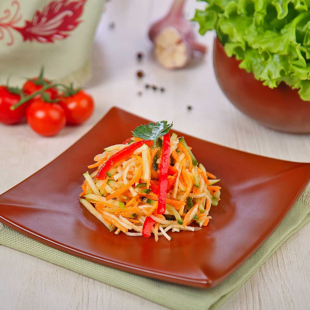 Морковь, корень сельдерея, яблоки, перец болгарский, огурцы свежие, масло подсолнечное, лук порей, чеснок, уксус бальзамический, соль, сахар-песок, зелень.
