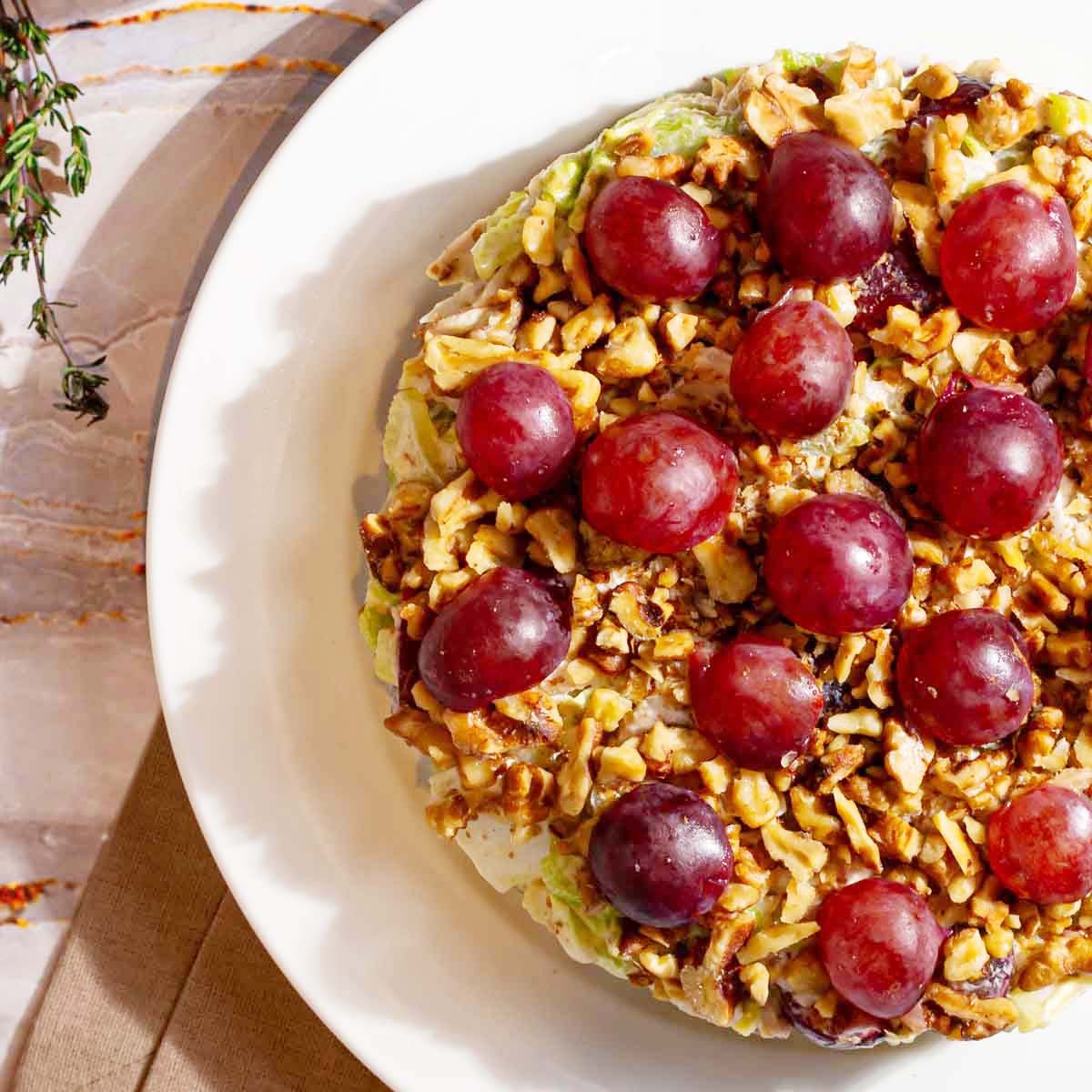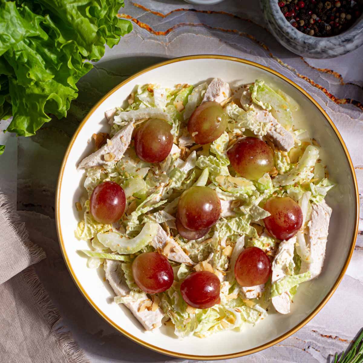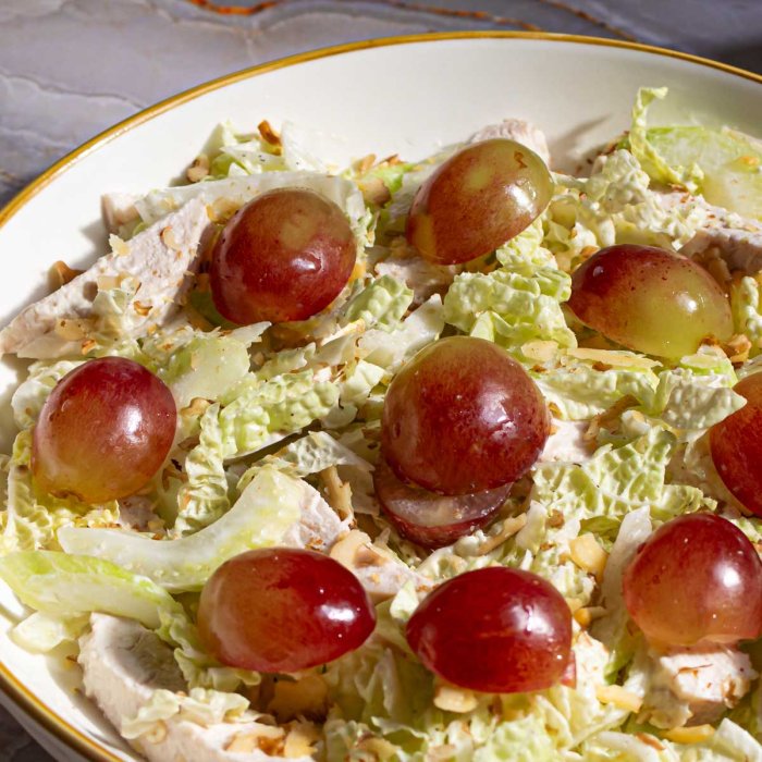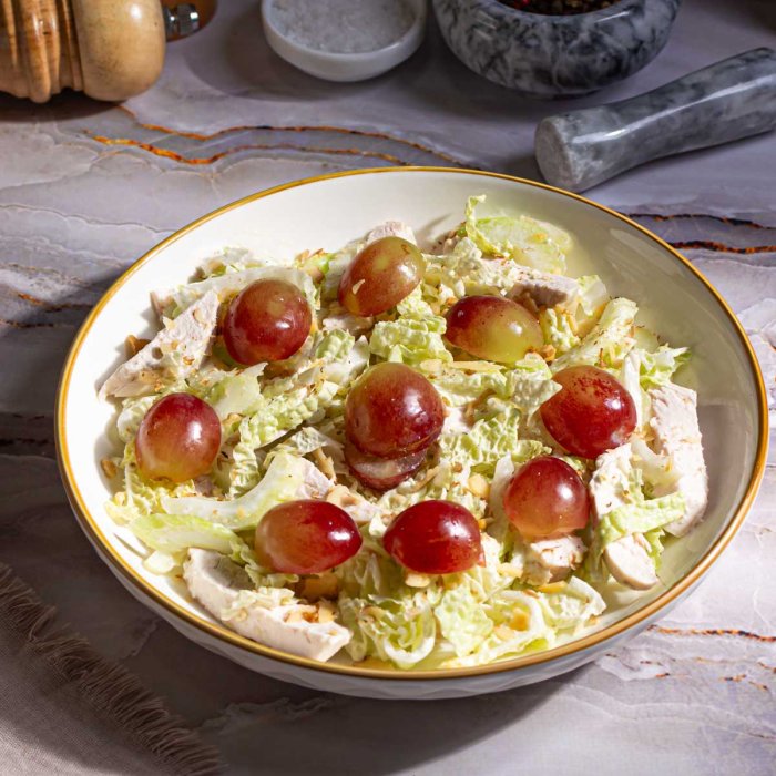 Филе куриной грудки, сельдерей стебель, капуста пекинская, виноград свежий, орехи грецкие, майонез, соль поваренная пищевая, перец черный молотый.