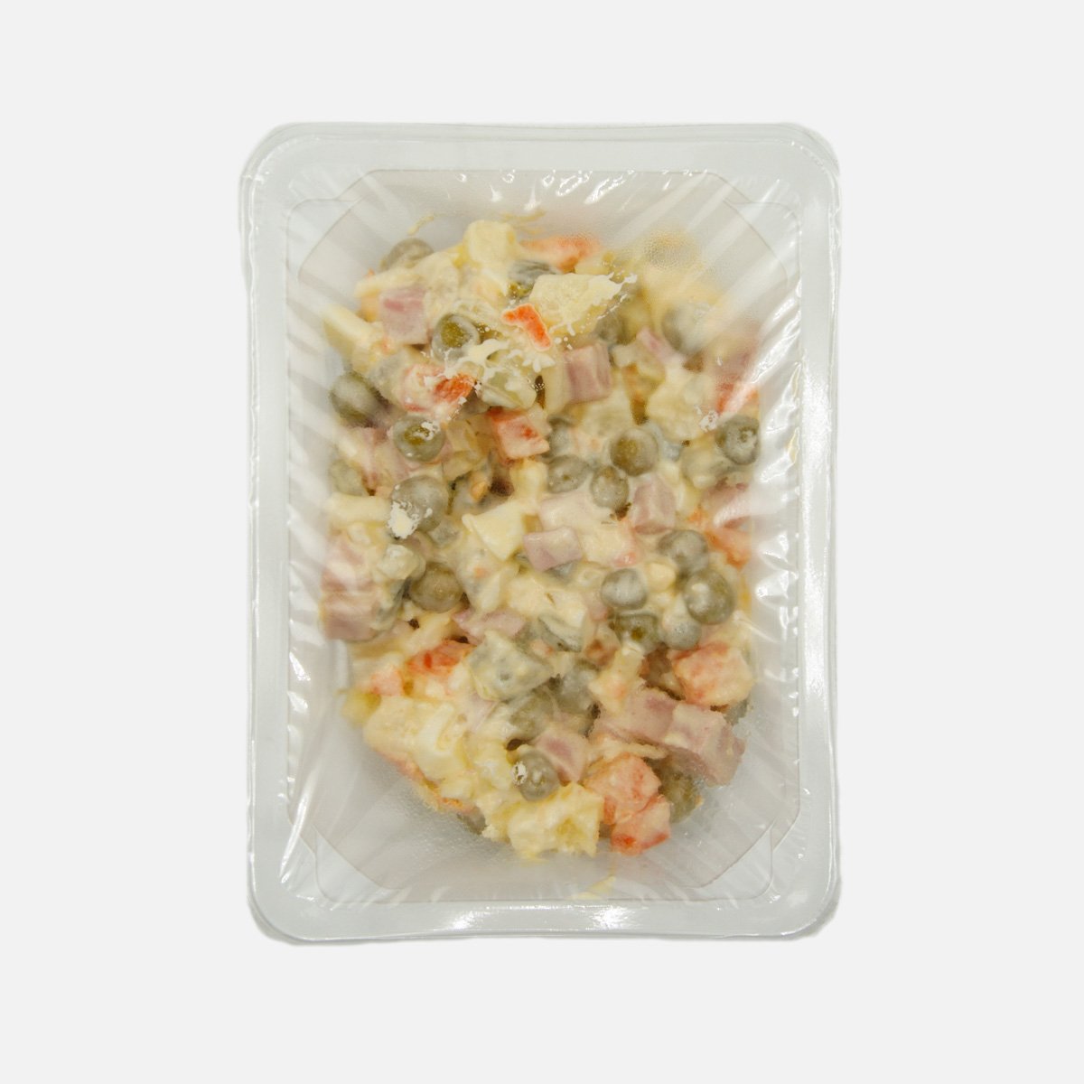 Огурцы консерв, зеленый горошек консерв, картофель, колбаса вареная, морковь, майонез, яйцо куриное, лук репчатый, зелень, соль, перец ч/м. Упаковано с применением условий модифицированной атмосферы.