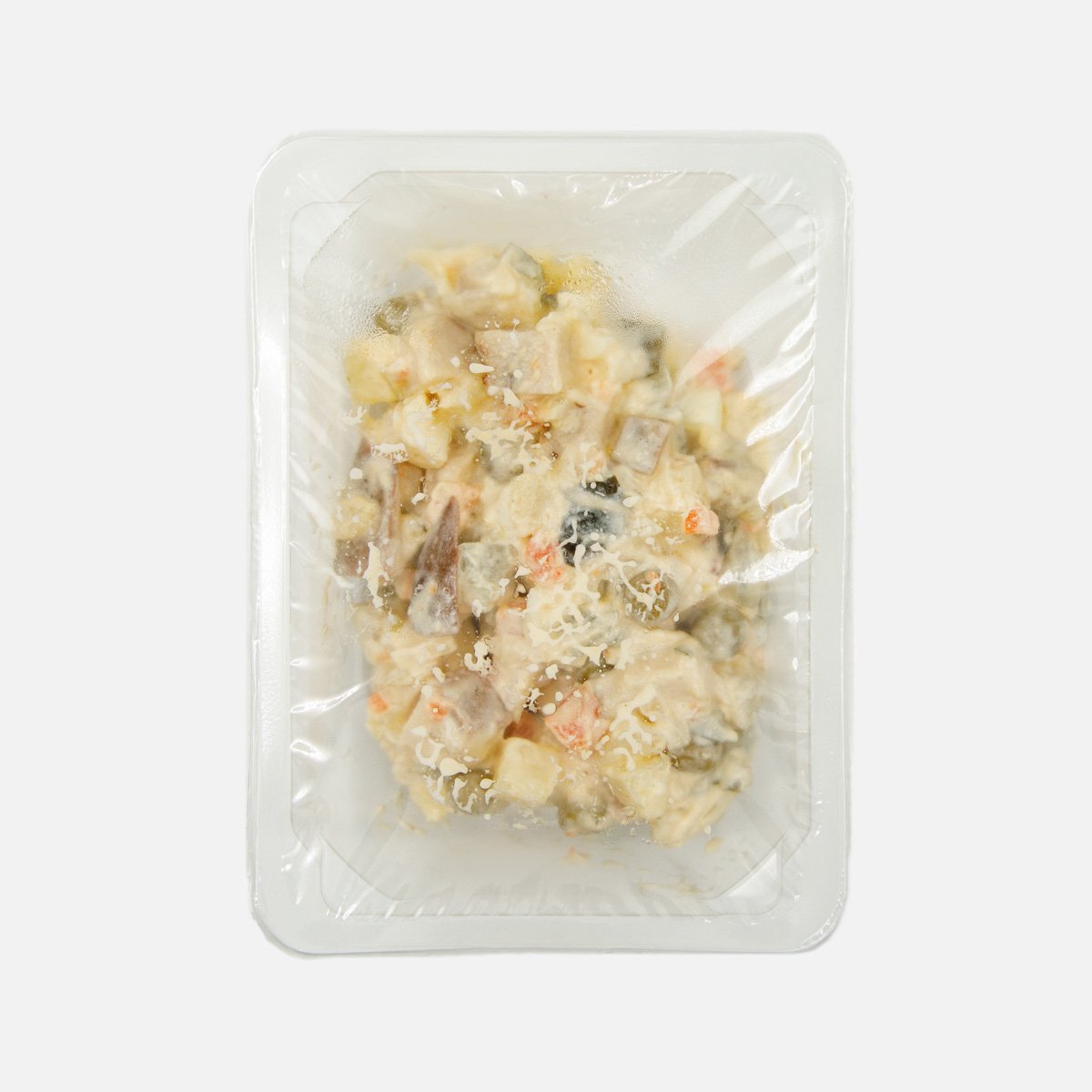 Огурцы консерв, мясо цыпленка, картофель, морковь, зеленый горошек консерв, майонез, яйцо куриное, лук репчатый, лимон, соус соевый, масло подсолнечное, соль, чеснок, приправа д/курицы, перец ч/м. Упаковано с применением условий модифицированной атмосферы.