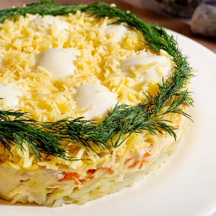 Мясо цыпленка, яйцо куриное, картофель, морковь, лук репчатый, майонез, сыр, горчица, зелень свежая, соль, перец ч/м