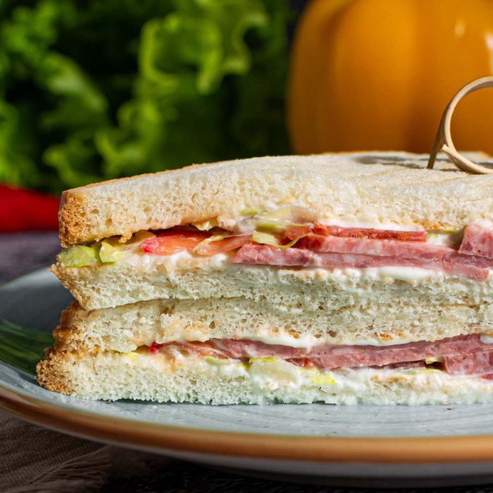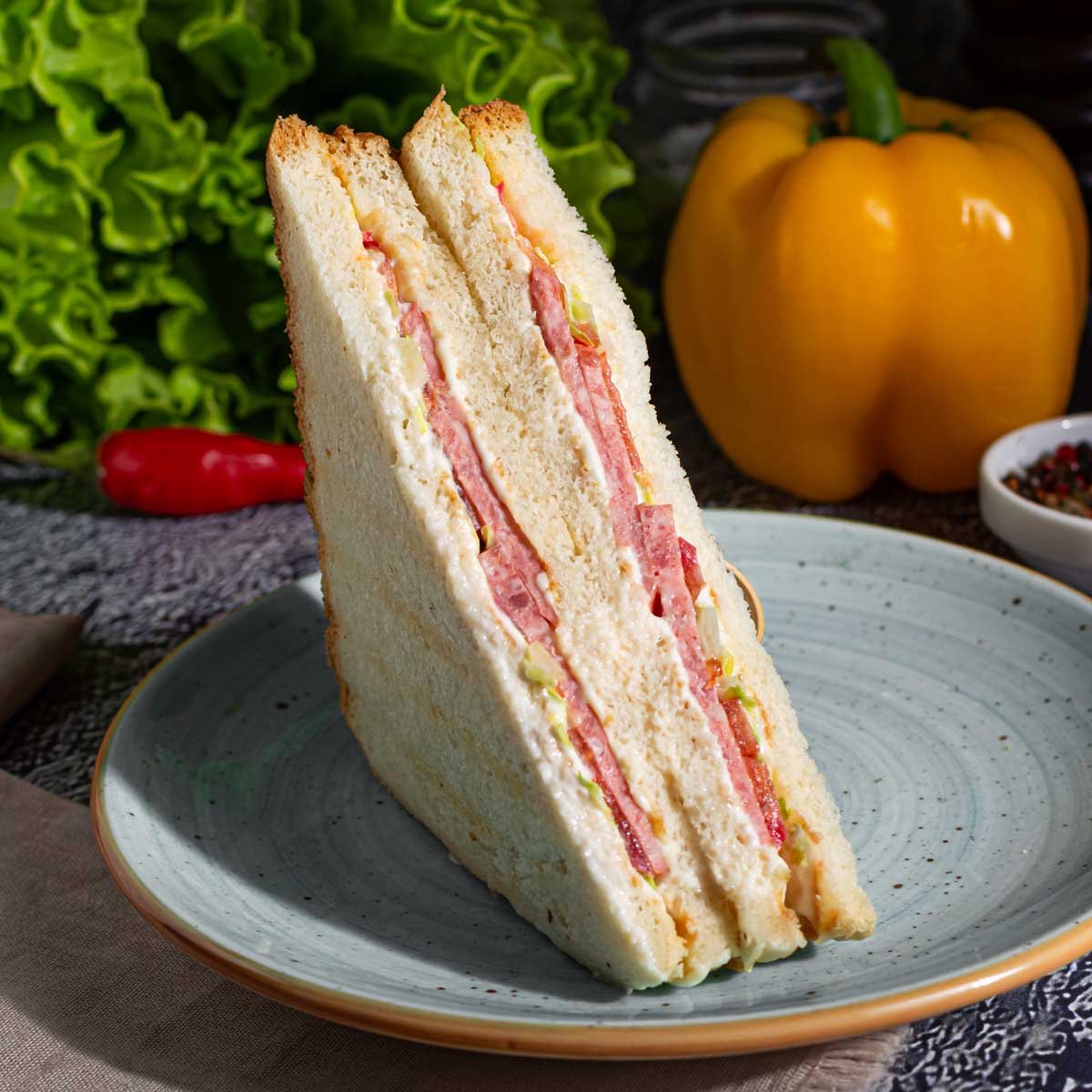 Хлеб для сэндвичей, сервелат полукопченый, сыр плавленый, томаты, лист салата Айсберг