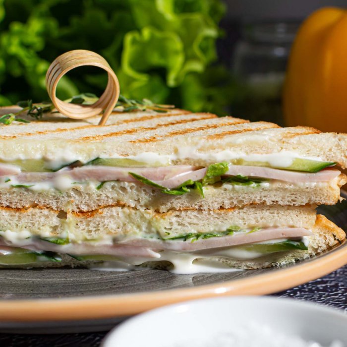Хлеб для сэндвичей, ветчина, сыр плавленый, свежий огурец, лист салата Айсберг.