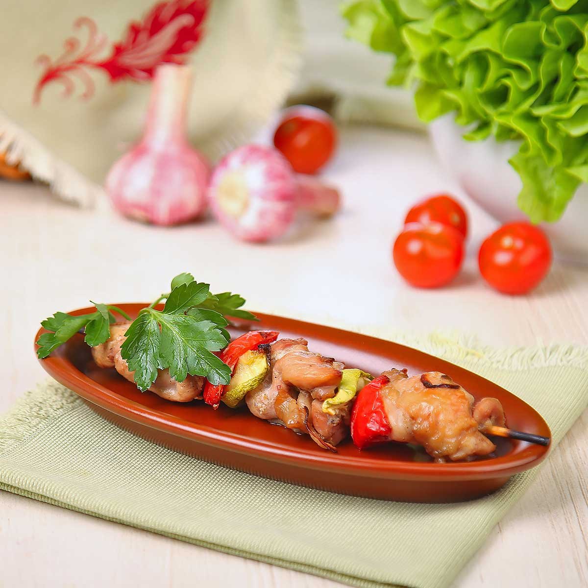 Красивые шашлычки из мяса курицы с болгарским перцем и цукини. Маринованные с соевым соусом, лимоном, черным перцем и чесноком и обжаренные на гриле.