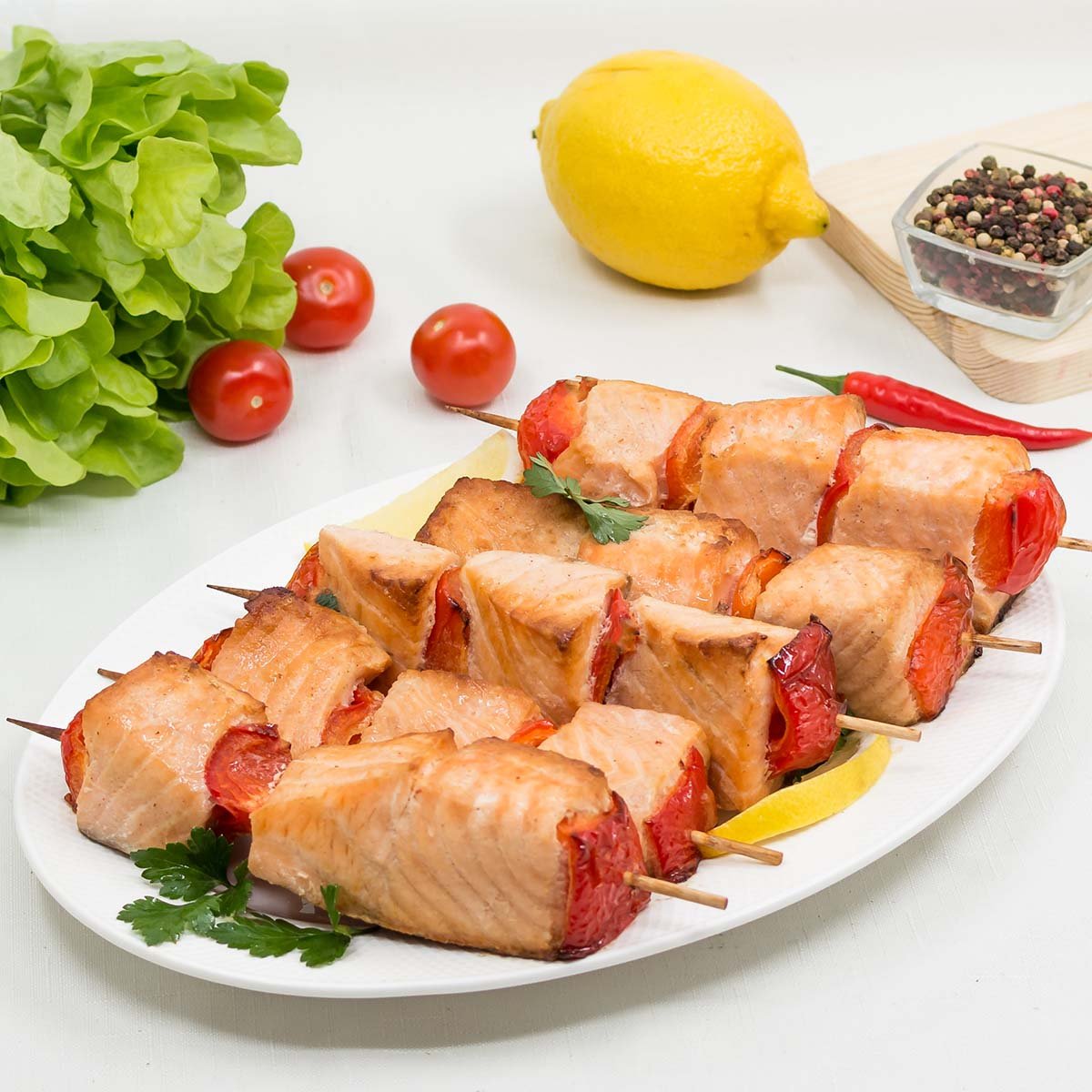Семга, маринованная в лимонном соке с имбирем и белым перцем, обжарена до идеальной корочки вместе с болгарским перцем. Соль и сахар подчеркивают естественную сладость рыбы, а зелень петрушки добавляет яркости вкусу. Это шашлык, который приятно удивит вас своей сочностью и насыщенностью. Закажите с доставкой и наслаждайтесь ресторанным вкусом у себя дома!
