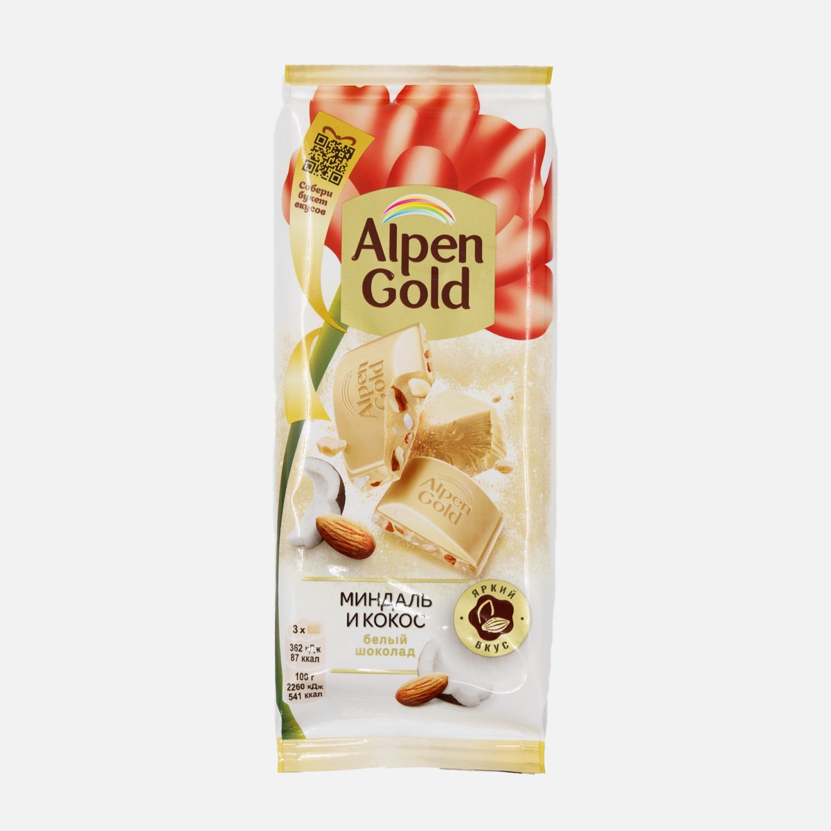 Шоколад Альпен Гольд белый с миндалем и кокосовой стружкой 80г