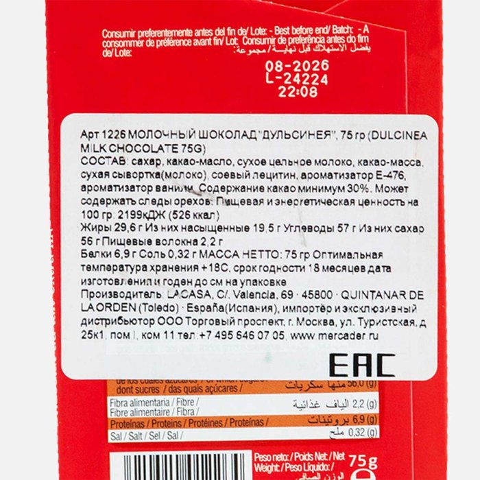 Шоколад Дульсинея молочный 75г
