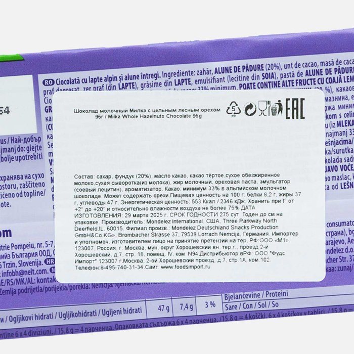 Шоколад Милка молоч с цельным лесным орехом 95г