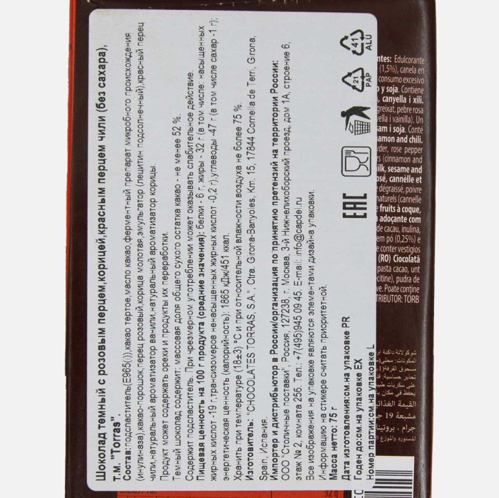 Шоколад Торрас Классик Лайн темный с кус ягод роз перца/кориц/чили 75г