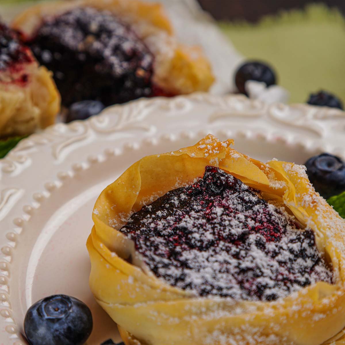 Тесто фило, черника, сахар, масло подсолнечное, яйцо куриное, крахмал, пудра сахарная.