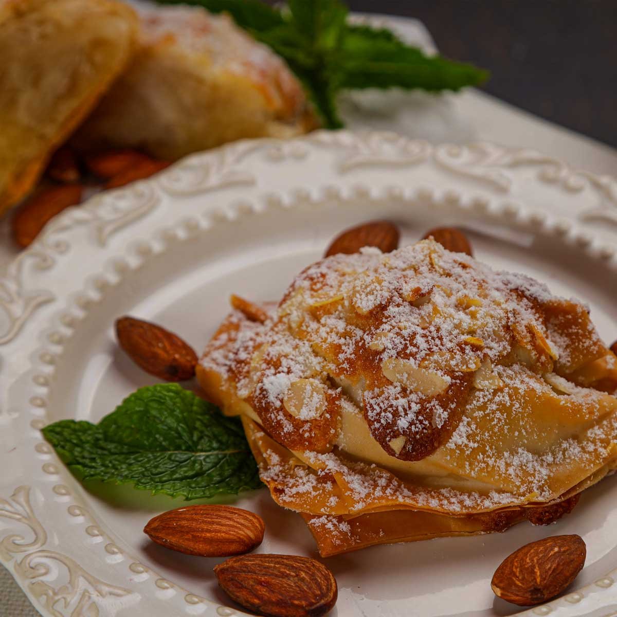 Тесто фило, масло подсолнечное, масло сливочное, мука миндальная, пудра сахарная, яйцо куриное, начинка миндальная, арахис, мука пшеничная в/с.