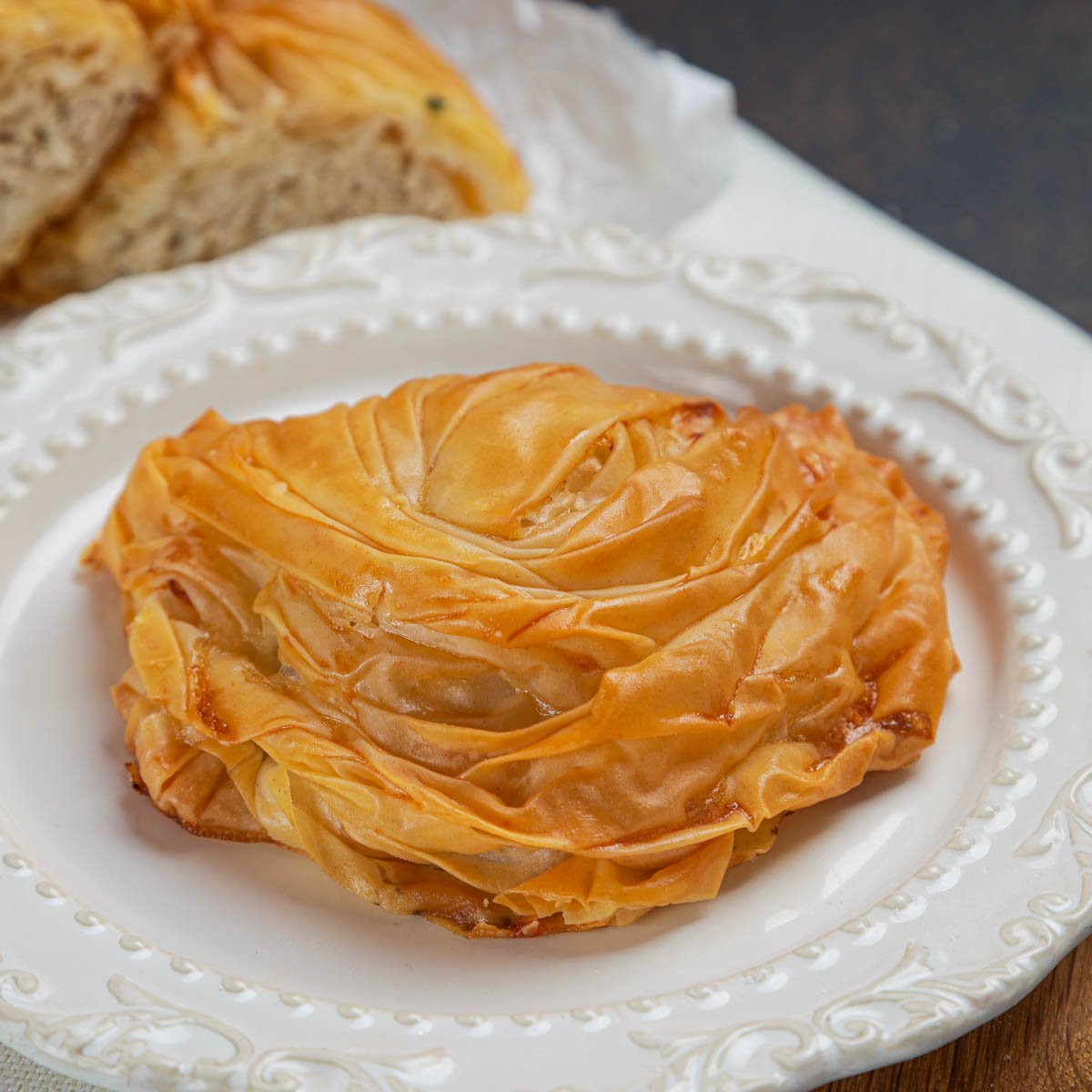 Тесто фило, мясо цыпленка, лук репчатый, масло подсолнечное растарка, яйцо куриное, масло сливочное, соль, зира, паприка, кориандр.