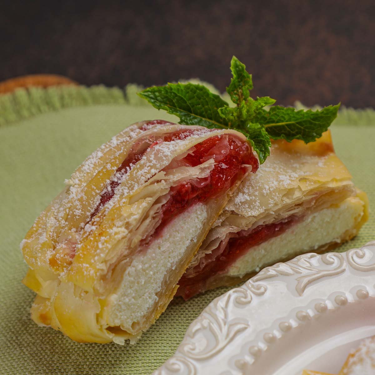 Тесто фило, творог, клубника, сахар, масло подсолнечное, сметана, яйцо куриное, пудра сахарная, крахмал, крупа манная, ванилин.