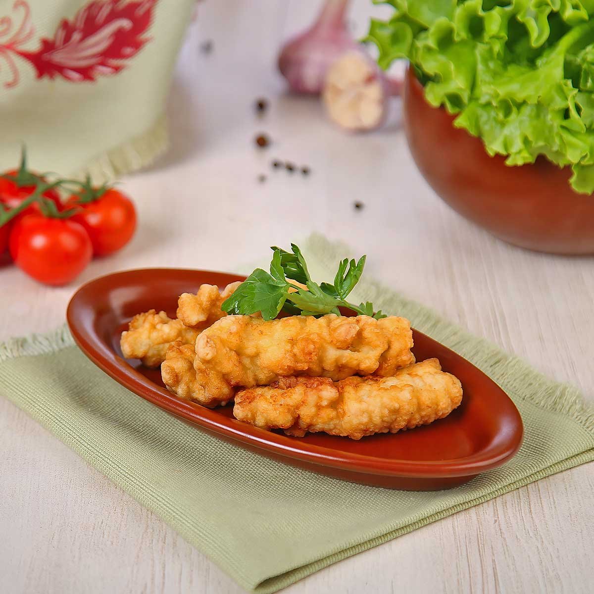 Кусочки нежного белого филе, обжаренные в кляре. Подавайте как горячую закуску или как самостоятельное блюдо.