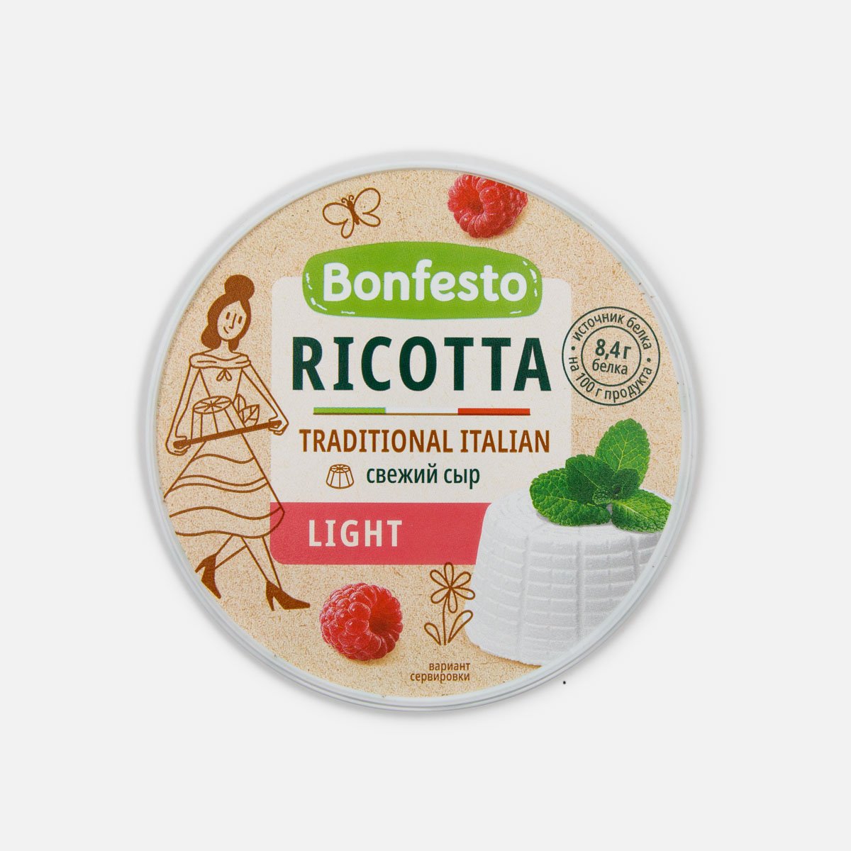 Легкую рикотту "Бонфесто" 40% жирности готовят из сладкой сыворотки, остающейся после приготовления моццареллы. Помимо сыворотки добавляется и молоко (в некоторых сортах рикотты используют молоко буйволиц, овечье). Этот сыр также коптят, однако наиболее распространённый вариант — свежая рикотта. В ней самое большое содержание влаги. По консистенции рикотта напоминает нежный творожок с небольшими комочками, однако вкус отличается довольно сильно: нет кисломолочного оттенка, свойственного для традиционного творога. Свой неповторимый сладкий вкус рикотта получила благодаря сладкой сыворотке, в которой присутствие лактозы равно примерно 2—4%.