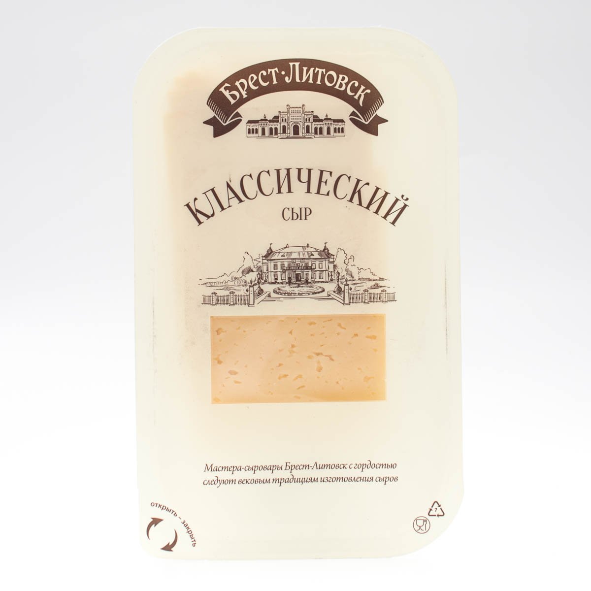 Полутвердый белорусский сыр "Брест-Литовск Классический" 45% жирности. Сыр имеет мягкий сладко-сливочный вкус и нежную, пластичную консистенцию. На разрезе сыр имеет рисунок, состоящий из глазков неправильной угловатой формы, равномерно расположенный по всей сырной массе. Классический сыр с изысканным сливочным вкусом на каждый день.
