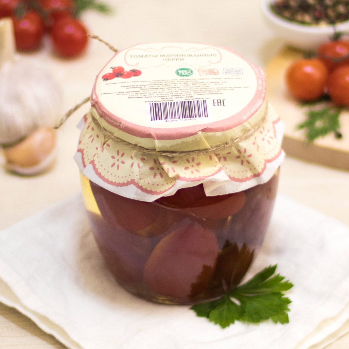 Томаты черри свежие, сахар-песок, соль поваренная пищевая, специи, чеснок, хрен, уксусная кислота, вода питьевая. Витамины: ß - каротин-0,66мг; В1 - 0,03мг; РР - 0,3мг; С - 14мг