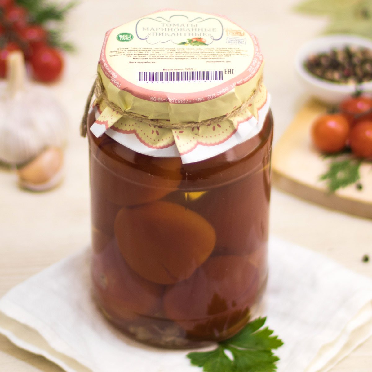 Томаты свежие, чеснок свежий, сахар-песок, соль, специи, уксусная кислота. Витамины: ß - каротин-0,66мг; В1 - 0,03мг; РР - 0,3мг; С - 14мг.