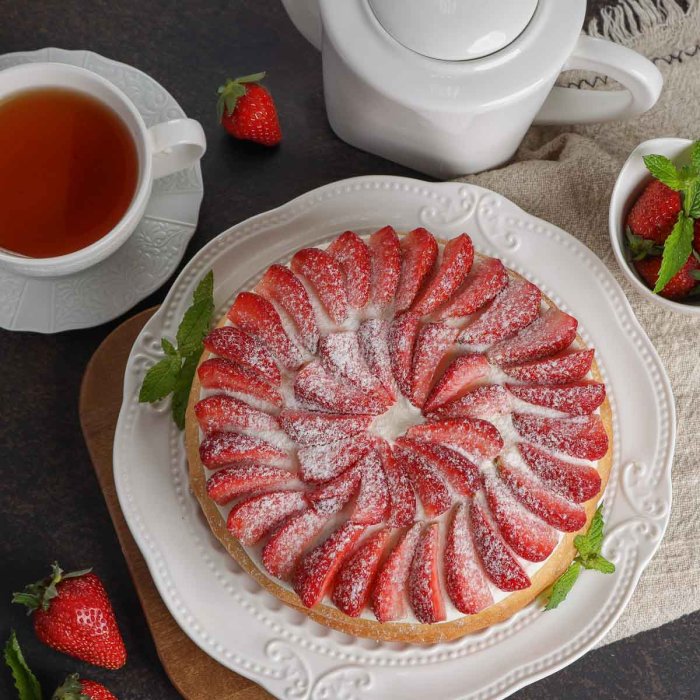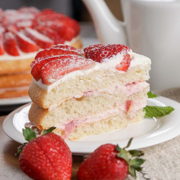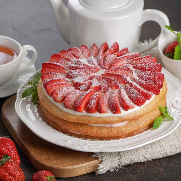 Сметана, клубника свежая, клубника с/м, смесь для бисквита, мука пшеничная в/с, яйцо куриное, масло подсолнечное, молоко цельное, заварной крем, сахар, сахарная пудра, загуститель, разрыхлитель.